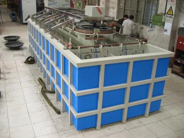 滾鍍自動線也有環(huán)形機(jī)械或液壓式自動線與直線龍門式自動線兩大類。環(huán)形機(jī)械式適宜于傾斜自動裝卸的鐘型滾筒